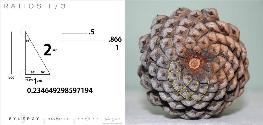 Všimněte si, že každý řádek na borovicovém kuželu je přesně o 23,46% větší než předchozí a že digitální kořen celého desetinného čísla je 1. Přesně to, čím jsme začínali. Mám pocit, že by to mohl být klíč k pochopení toho, jak desetinná místa skutečně fungují. Myslím, že "zlatý poměr" je zlatý řez, protože první desetinné číslo je 6. Myslím, že jakýkoli poměr, který má digitální kořen 3,6 nebo 9, lze v přírodě najít stejně často.